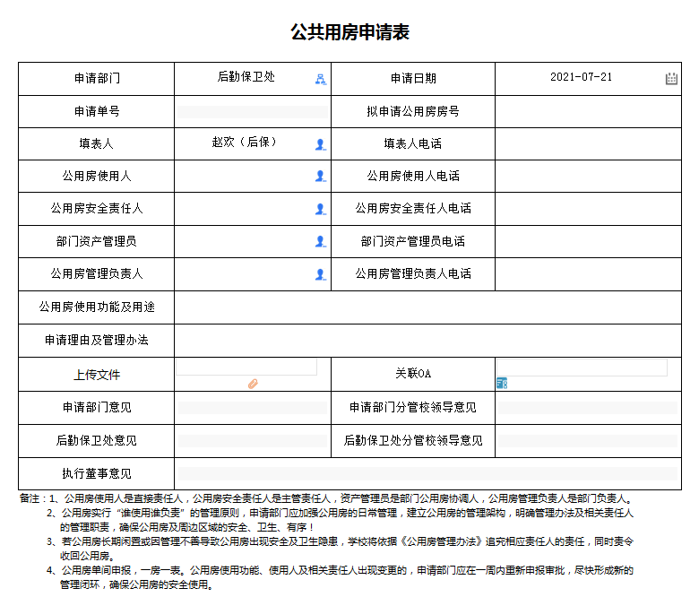 第六条 公共用房按其用途划分成若干个类别,试行公共用房管理办法,以建立公共用房管理使用的自我约束机制。各部门有公共用房需求的,需填报《公共用房申请表》。