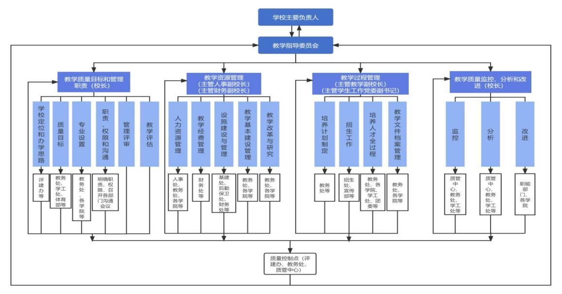 其中,校长及相关校领导主要负责教学质量目标和管理职责相关工作,主要内容包括学校定位和办学思路,质量目标,专业设置,职责、权限和沟通,管理评审,教学评估。主管人事副校长和主管财务副校长主持教学资源管理工作,主要内容包括人力资源管理、教学经费管理、设施建设与管理、教学基本建设管理、教学改革与研究。主管教学副校长和主管学生工作党委副书记主持教学过程管理工作,主要内容包括培养计划制定、招生工作、培养人才全过程、教学文件档案管理。主管教学副校长主持教学质量监控、分析和改进工作。校领导每学期均进行随机听课评价,在特殊时间节点(如开学、重要节假日、重要事件)对教学秩序进行巡查。