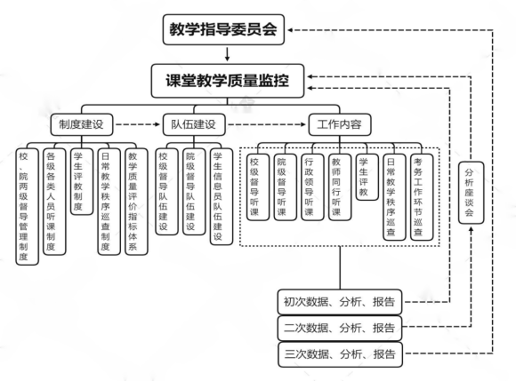 三是教学督导、督学制度。教学督导采取咨询、听课、会议、座谈、问卷等方式,对学校教学活动、教学过程以及教学管理进行督查、调研、反馈、指导等。督学主要是从任课教师、辅导员、教学管理人员、学生信息员四类人员入手,分工协作,督查学生学习过程。