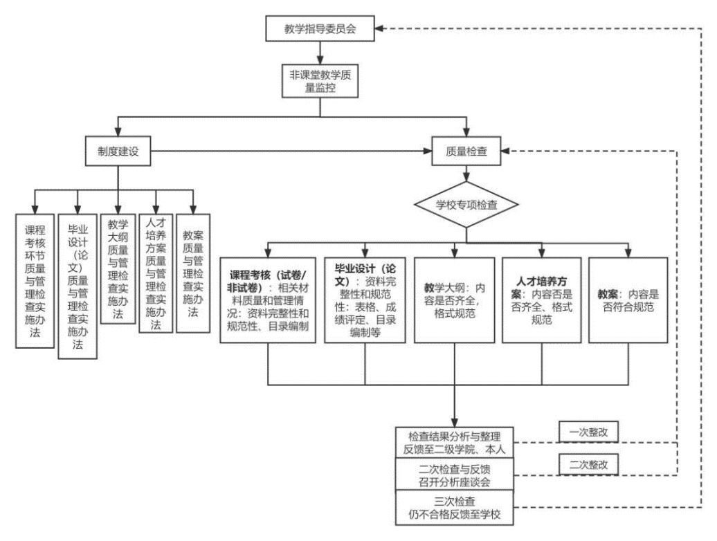 其中,课堂教学质量监控(见图3)通过督导管理制度、听课制度、学生评教制度、日常教学秩序巡查制度、教学质量评估指标体系等制度建设,依靠校、院两级督导队伍、学生信息员,组织校、院级督导、行政领导听课,教师互评、学生评教,开展日常教学秩序检查以及考务巡查等课堂教学质量监控工作。非课堂教学质量监控(见图4)则是依据本科各主要环节质量标准制订课程考核、毕业设计(论文)、教学大纲、人才培养方案、教案等质量与管理检查实施办法,定期开展各类专项检查。通过初次检查、分析、整改、二次监控、循环监控的模式开展全校课堂与非课堂教学质量的监控工作,并及时向教学指导委员会汇报监控、分析、改进结果。